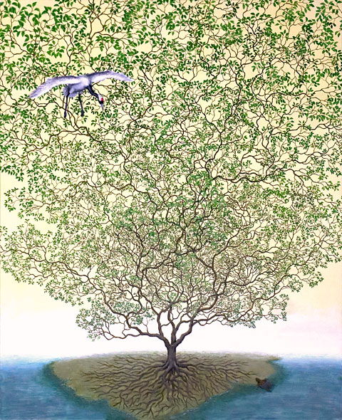 | Reflect | 命が限りなく続く「寿限無」にかけて、枝葉が限りなく伸びてゆく様を描きました。 長寿を象徴する縁起物である鶴と亀も配置しましたが、あくまでもメインは樹木だという構図になっています。 「Mother Tree」と同時進行で制作したのですが、ともに樹木から生命の在り方を捉えて表現したもので関連作品と言えます。 油性ボールペンで描き始めたのですが時間がかかり過ぎて期限に間に合いそうもなかったため、新たに1からアクリルで描いたのが本作です。 頓挫したほうは2021年5月に「Endless Tree」と題を改めてリリースしました。 描き直したはいいもののいつもの悪い癖が出て、イメージしていたよりも遥かに細かくなってしまい、これまた相当な時間を費やすこととなりました。 それが結果として仕上がりに良い影響を与えていればいいのですが、その奮闘ぶりは見えたとしてもごちゃごちゃした印象になってしまいました。 葉の大きさや明暗を使い分けて奥行き感を出そうと試みたもののそれもうまくゆかず、一方で鶴だけは立体的で合成したかのような違和感があります。 絵を描くのは難しいと改めて思い知らされた作品となりましたが、更に成長するための課題が見つかるというのは嬉しくもあります。 ちなみに本作と同音で「樹気無」という作品もありますが、関連性はありません。 |