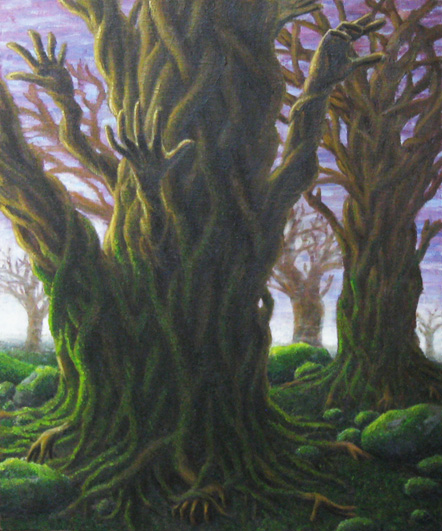 | Reflect | 木の幹から生える枝や根が人間の手のように感じられたことから着想しました。 木が“手”を伸ばすのはそれぞれ上や下で、それが人間だとしたら何を意味するのだろうと考えたところ、地上への抵抗や拒絶をしつつも決して前に突き出さない「非暴力不服従」(=マハトマ・ガンジー)が浮かびました。 人間は木を伐採するが、木は決して人間に危害を加えない。 しかし秘めている気持ちはあるのかもしれない。というのがテーマです。 かなりの力を込めて描きましたが、木の立体感が薄くなってしまったのが残念です。 森林をイメージしましたが、明らかに木が少なく、奥が適当過ぎですね。 手前の手や逆光の当たり具合は気に入ってます。 |