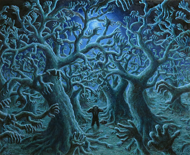 | Reflect | 4〜5年前にタイトルだけが浮かび、手つかずのまま温めていた作品です。 喧騒とはほぼ100%の確率で都会を形容する言葉として用いられますが、都会の真逆である自然(森)に当てはめたらどうなるのか。 その矛盾を「森の喧騒」と言葉で表現することはとても簡単なのですが、それを視覚化するとなるとどう表現して良いものか、長い間考えあぐねていたのです。 シンプルに「森の中も大勢の人で溢れている」でも成立するのですが、それでは森を舞台にする必然性もなく、喧騒という精神的に煩雑なイメージの言葉にも直結しません。 結果的に、肉体は喧騒から逃れたとしても精神は引きずってしまうというテーマになりました。 構図は狼狽する人物を俯瞰(客観)的に描いておりますが、周りの木々に人の姿を重ねてしまうというその人物の主観も折り混ざっています。 色使いも憂鬱な精神状態を投影するため青を基調としました。 10年程前に手掛けた「Mahatoma」という作品も同じく木の枝や根を人間の手に見立てたものなのですが、使い回しというよりも別のアプローチから結局同じ形に辿り着いたという感じです。 というのも、顔の表情(目や口)は“相手の人間”の気持ちを読み取る材料になりますが、一方手は暴力や親切心を体現することはできるものの、どういう事情や心情によりそのような行動に出たのかまでは読み取れないツールです。 そのため、主人公の主観として“相手”が考えもなしに心ない行動を仕掛けてきているように思える、故に逃れる術もない、という意図でこのようになりました。 これからこのテーマを更に追求してみたいと思える、大事な作品となりました。 |
