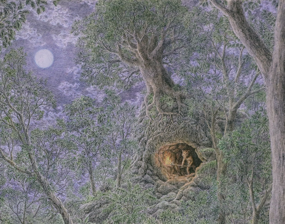 | Reflect | ペン画作品「森の夜に(No.2)に水彩で着彩しました。 ペンでかなり細かく描き込んだため着彩するのは勿体ないと思っていたのですが、これまでの経験則で着彩することでより良くなるという確信があったため踏み切りました。 元々「森の夜に」の2作目として描いた作品だったのですが、着彩によりかなりの手応えを感じ、この作品はこの作品として独自にプロモーションしたいと思い、タイトルに「〜武と知〜」を加えて新作としました。 前作は「なんだか迫力がある」「なんだか面白い」というビジュアルでのインパクトを与えられれば良いなと思っていたのですが、 今作では繊細さが加わったことによりメッセージ性を強調したく思い、「争うことのあさましさ」や「生きることの試練」そして「手段を講じれば乗り越えられる」といった方向にフォーカスしました。 |